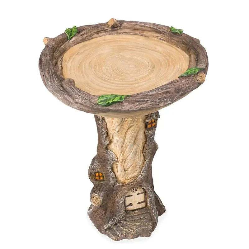 Diese dekorative Vogeltränke verbindet ein verspieltes Märchen-Design mit einer natürlichen Optik und ist für die Gestaltung von Garten- oder Außenbereichen vorgesehen. Das Design erinnert an einen alten Baumstamm mit kleinen Details wie Tür, Fenster und Treppe im Miniaturstil.